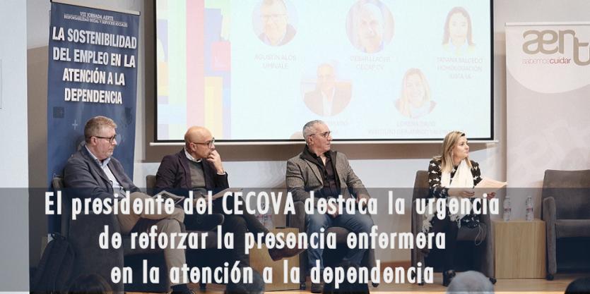El Consejo de Colegios de Enfermeras y Enfermeros de la Comunitat Valenciana (CECOVA) ha participado en la VIII Jornada AERTE de Responsabilidad Social y Servicios Sociales, celebrada en el Auditorio CEV bajo el lema La Sostenibilidad del Empleo en la Atención a la Dependencia, un encuentro en el que se ha puesto de manifiesto la necesidad urgente de hallar fórmulas para fortalecer los equipos profesionales de los centros residenciales.